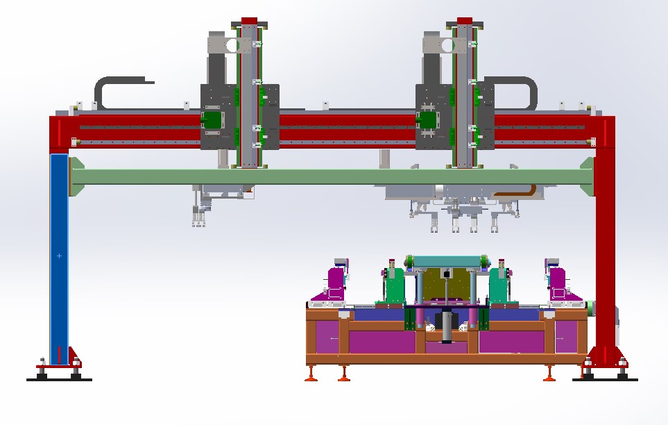 自動排版機的主要功能單元有:玻璃輸送定位系統(tǒng)、抓取行走系統(tǒng)、視覺檢測系統(tǒng)、電控系統(tǒng)等;通過以上功能單元,實現(xiàn)了將自動串焊機串焊好的電池串,按照工藝尺寸要求和排版方向順序自動排版鋪設到玻璃(EVA已經(jīng)鋪設)上,組成電池串陣列。玻璃/EVA通過傳輸線傳輸至指定位置,機械手抓取電池串實現(xiàn)CCD定位、自動旋轉、自動排版功能。設備通過同步帶傳輸與自動生產(chǎn)線對接,實現(xiàn)了自動流水作業(yè)。